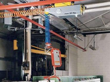此机械手在功能上与气动平衡吊类似,具有全行程的“漂浮”功能,但是提升位移比气动平衡吊要小, 大只有1800mm,而且 大负载只有100Kg。由于软索式助力机械手有双关节的机械臂来实现水平位移,工作半径可以达到2500mm,所以它比气动平衡吊具有操作更灵活、速度更快捷的功能。