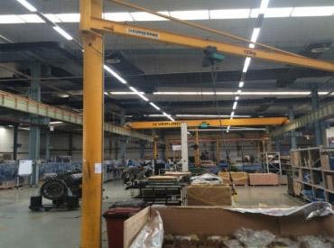 悬臂吊起重机工作强度为轻型,起重机由立柱,回转臂回转驱动装置及电动葫芦组成,立柱下端通过地脚螺栓固定在混凝土基础上,由摆线针轮减速装置来驱动悬臂回转,电动葫芦在悬臂工字钢上作左右直线运行,并起吊重物。起重机旋臂为空心型钢结构,自重轻,跨度大,起重量大,经济耐用。内置式行走机构,采用带滚动轴承的特种工程塑料走轮,摩擦力小,行走轻快;结构尺寸小,特别有利于提高吊钩行程。